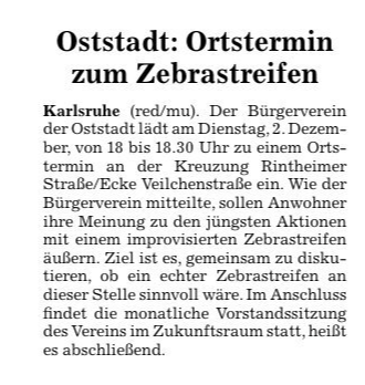 Der Bürgerverein Oststadt ist zum Thema Verkehrssicherheit und Zebrasteifen aktiv, hier gibt es den BNN Artikel vom 01.12.2025 https://akb-karlsruhe.de/wp-content/uploads/2025/12/BNN_20251201_Oststadt.png