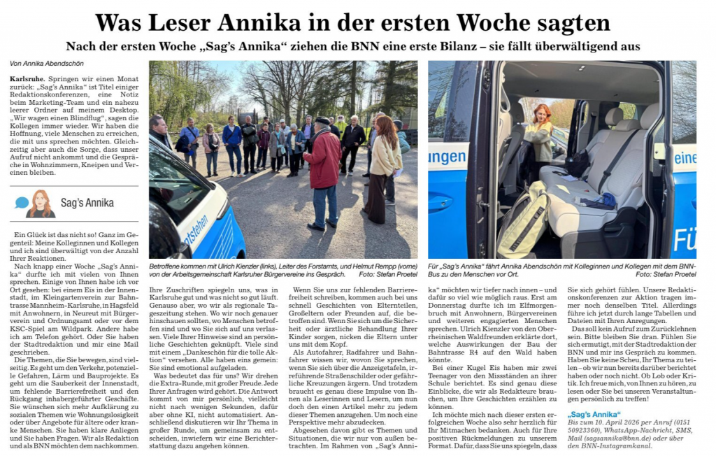 Viele Bürgervereine haben sich mit eigenen Themen bei der BNN Aktion „Sags Annika“ eingebracht. In den BNN vom 21. März 2026 wird über die ersten Aktionen, bei denen auch der Vorsitzende der AKB dabei war, berichtet